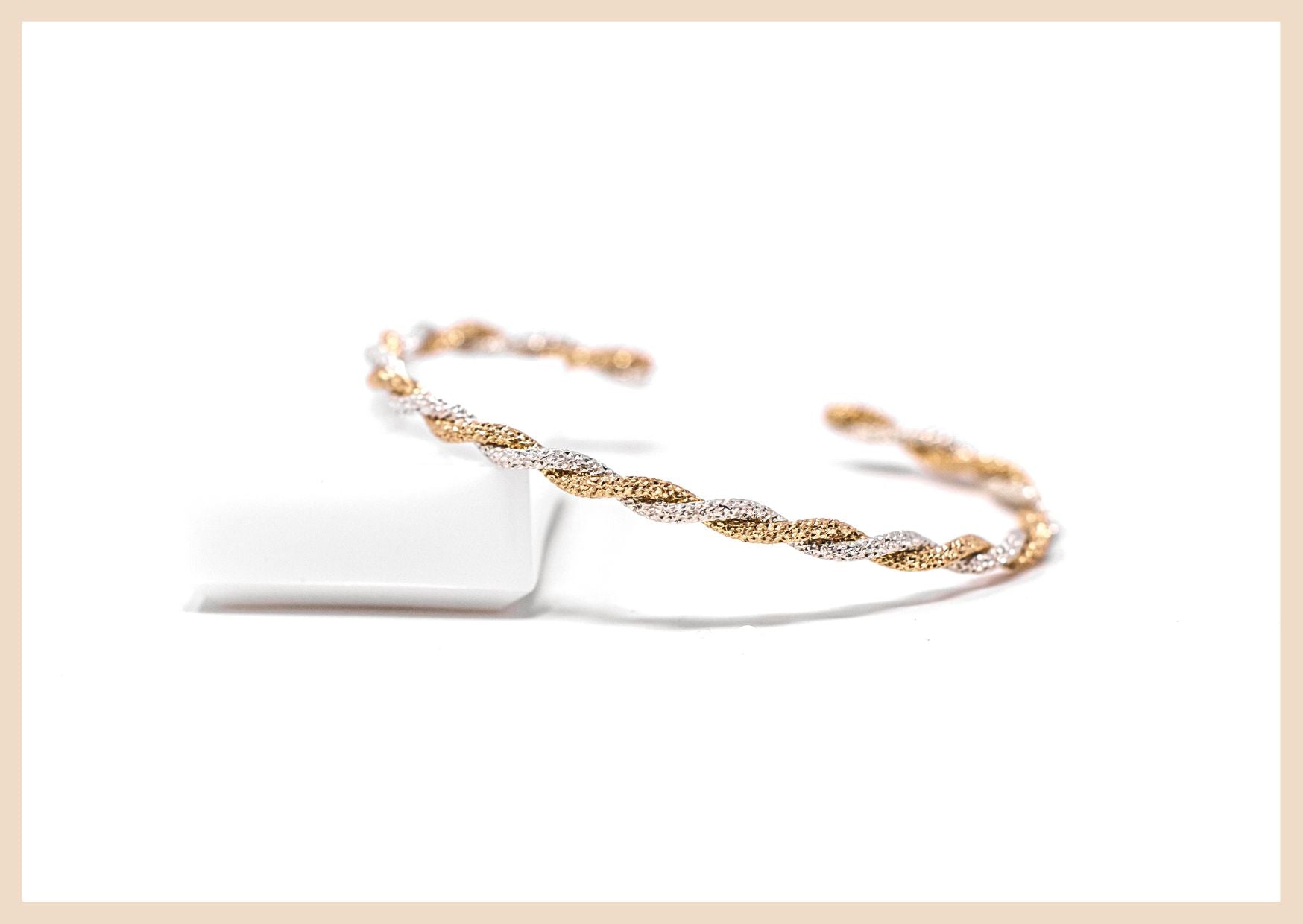 The Embrace Sparkly Entwined Gold and Silver Bangle Cuff Bracelet is the perfect bracelet if you love mixed metals. It is made of sterling silver and gold filled wires twisted together to make a stunning addition to your stack. (CHECK SIZING INSTRUCTIONS BELOW)