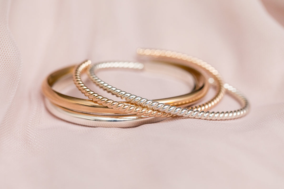 Gold-filled and sterling silver bracelets by Anna Shae Jewelry that can be personalized by engraving a special name, date, or short message. Free local pick up in Lexington, Kentucky, or free shipping on orders over $150. Bangles and bracelets come in a variety of different sizes. Wear them all the time and never take them off.